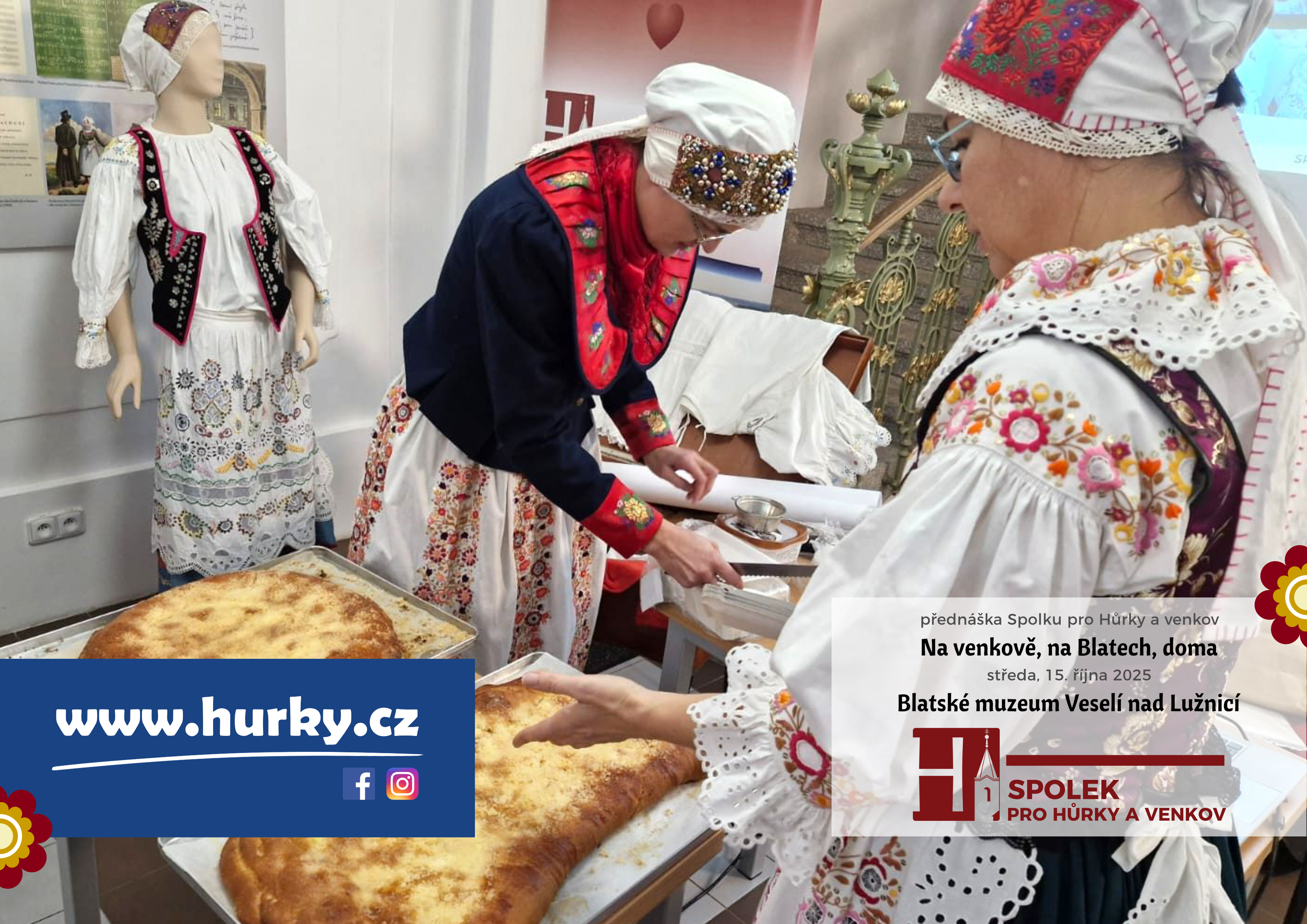 Není pochyb o tom, že Hůrky patří na Blata. A není tedy divu, že náš spolek udržuje již řadu let kontakt s Blatským muzeem v Soběslavi a Veselí nad Lužnicí. Důkazem této spolupráce jsou naše krásné kroje, zhotovené přesně tak, jak má být. Už v loňském roce jsme dostali nabídku na prezentaci svých spolkových aktivit, ale konkrétní termín připadl až na letošní podzim. Ve středu 15. října 2025 od 17 hodin tak vystoupíme se svým příspěvkem Na venkově, na Blatech, doma v rámci přednáškového cyklu Staré a nové zvěsti ve Weisově domě ve Veselí nad Lužnicí. Přednášku koncipujeme jako kontaktní, představíme své aktivity, projekty a formy spolupráce, tradiční blatskou měchuru s komentářem a ochutnávkou (a třeba i trochou kávy), sbírkovou činnost s ukázkami a předvedením svých krojů. Jednak těch starých, které se nám podařilo získat a zachránit, jednak těch nově ušitých. Nad látkami, materiály i předměty pak můžeme diskutovat a propojit příjemné s užitečným. Zveme tímto všechny. Spolu s kolegy z Blatského muzea se těšíme na viděnou ve Veselí! | Obrázek zde, pozvánka zde, odkaz zde.