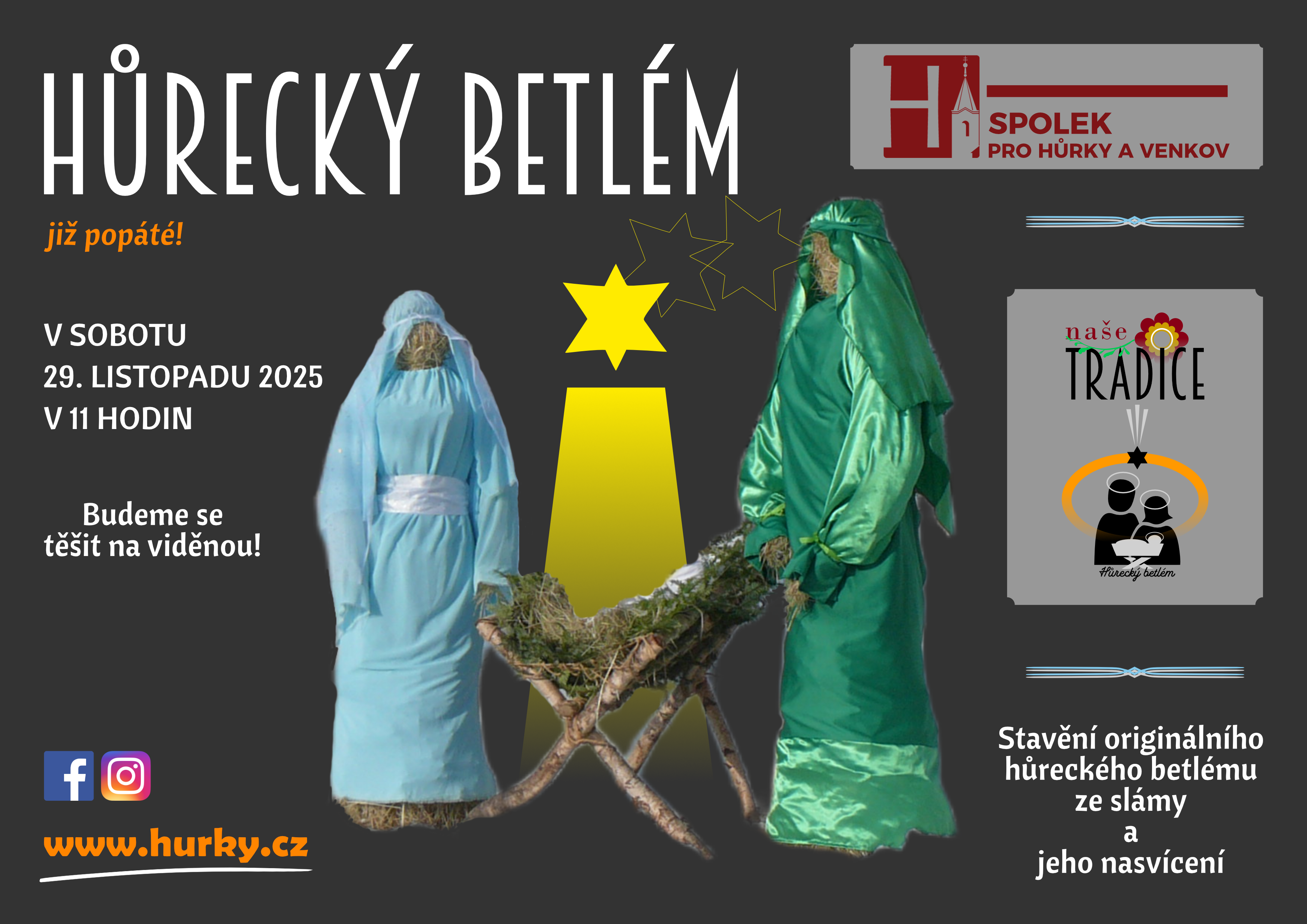 Letos již popáté budeme stavět tradiční slaměný hůrecký betlém tak, aby nám připomínal radostnou událost o narození Páně po celý advent a Vánoce. Instalace hůreckého betlému proběhne v sobotu 29. listopadu 2025 od 11 hodin před kaplí na návsi. Na první adventní neděli tedy bude připravený i s osvětlením. Postavy svaté Rodiny byly pořízeny z vlastních prostředků členů spolku a vyrobeny svépomocí, a to včetně jejich oděvů. Zveme každého, kdo se bude chtít zúčastnit a setkat se v přátelské atmosféře. Stavění hůreckého betlému probíhá v rámci spolkového projektu Naše tradice. Přejeme všem klidný advent a v sobotu na viděnou!