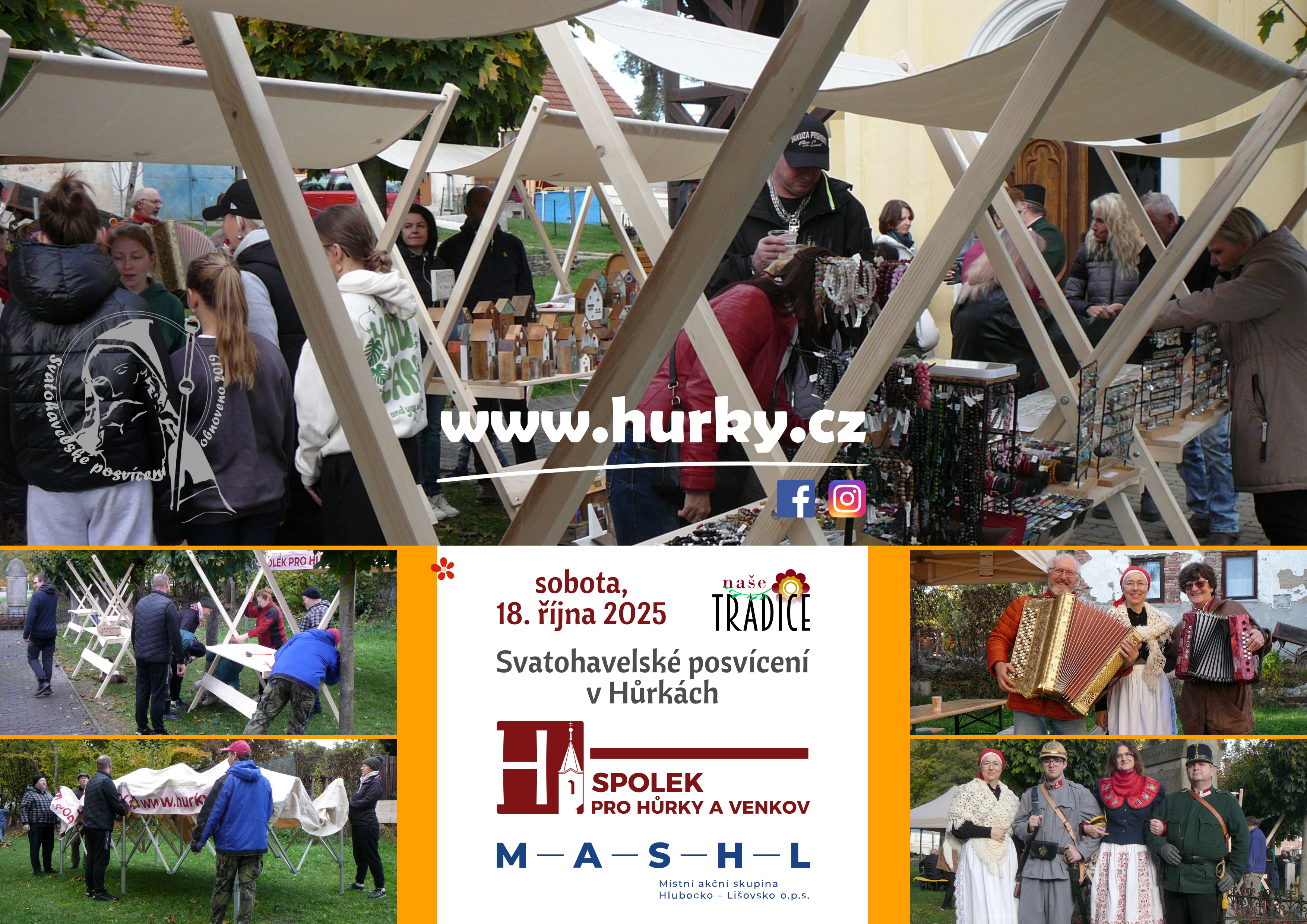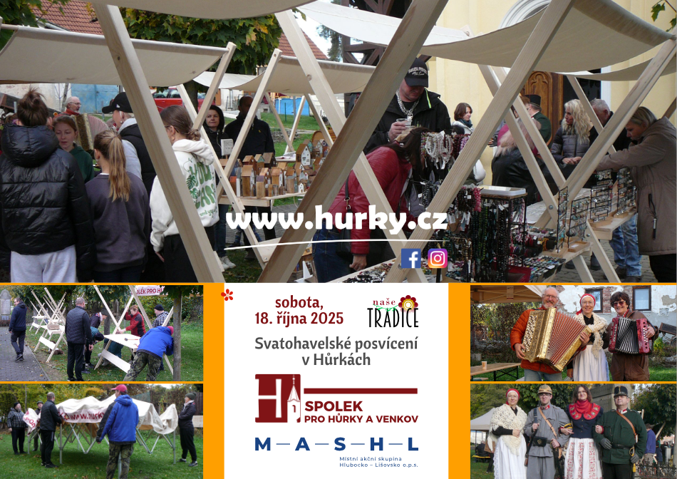 Zveme vás tímto na pátý ročník již tradičního Svatohavelského posvícení v Hůrkách, které se uskuteční v rámci projektu Naše tradice v sobotu 18. října 2025 na návsi. Jako obvykle začneme program mší svatou s P. Marcinem K. Chmielewskim ve 14 hodin, od 15 hodin pak bude před kapličkou posvícenský trh s regionálními potravinami a dalšími výrobky. Moc nás těší, že se nám letos podařilo získat prostředky na pořízení nového vybavení, mezi které patří také dřevěné stánky. Jarmark tím získá přívětivější podobu a trhovci lepší prostor pro sebe i své zboží. Vybavení bylo pořízeno v rámci programu budování kulturně-sociálního zázemí pro komunitní život na venkově. Děkujeme všem svým partnerům, MAS Hlubocko – Lišovsko, TH Kaffee České Budějovice, Hasičskému družstvu Dračice Lišov, SOU Lišov, harmonikářům Josefu Fiktusovi a Jiřímu Tvarohovi, ale také městu Lišov za podporu i zpřístupnění hůrecké školy, jejíž prostory tak můžeme opět využít pro uskladnění mobiliáře, ale i při nepřízni počasí. Pozvánku s programem naleznete zde. Těšíme se na všechny!