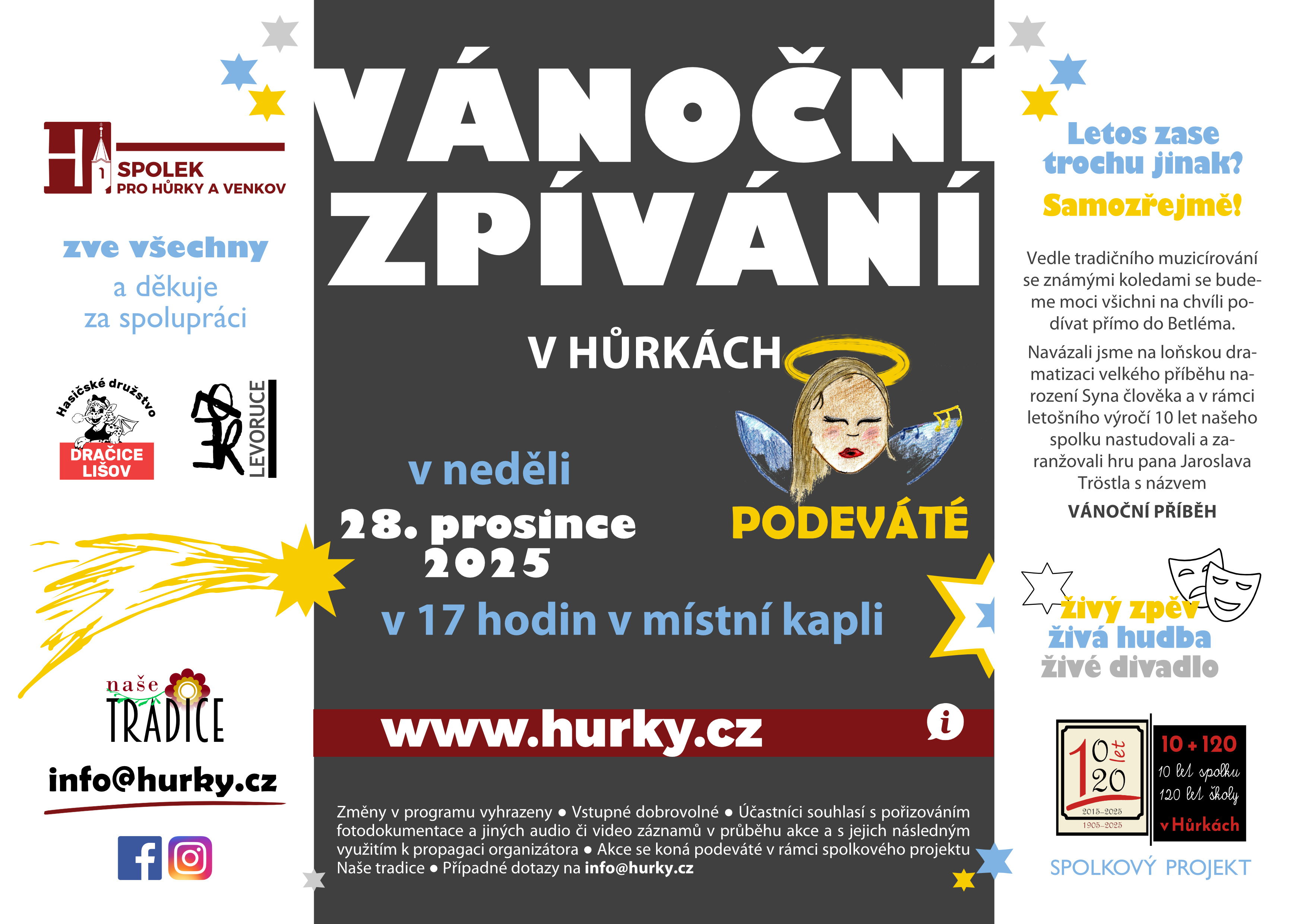 V letošním roce jsme si připomínali 10 let trvání našeho spolku a 120 let od postavení školy v Hůrkách v rámci spolkového projektu 10 + 120. Chtěli bychom proto tento jubilejní rok uzavřít něčím důstojným. Poslední akcí, která se stala již tradiční. Vánočním zpíváním, jež se uskuteční v neděli 28. prosince 2025 od 17 hodin v kapli sv. Jana Nepomuckého. Začínali jsme nesměle a s málem hned v roce 2015, ale od té doby vánoční zpívání stále něčím obohacujeme. Letos navazujeme na loňskou dramatizaci koled nastudováním hry Vánoční příběh, kterou napsal pan Jaroslav Tröstl. Přesuneme se tak do Betléma a vyslechneme si, co si tak mohli říkat ti, kteří postávali u právě narozeného Spasitele. Tradiční koledy, živá hudba i živý zpěv nás všech s divadelními prvky určitě obohatí sváteční čas vánoční. Už podeváté se těšíme na viděnou! Děkujeme svým partnerům, lišovskému hasičskému družstvu Dračice a hůreckému spolku Levoruce. Pozvánka zde, texty zde.